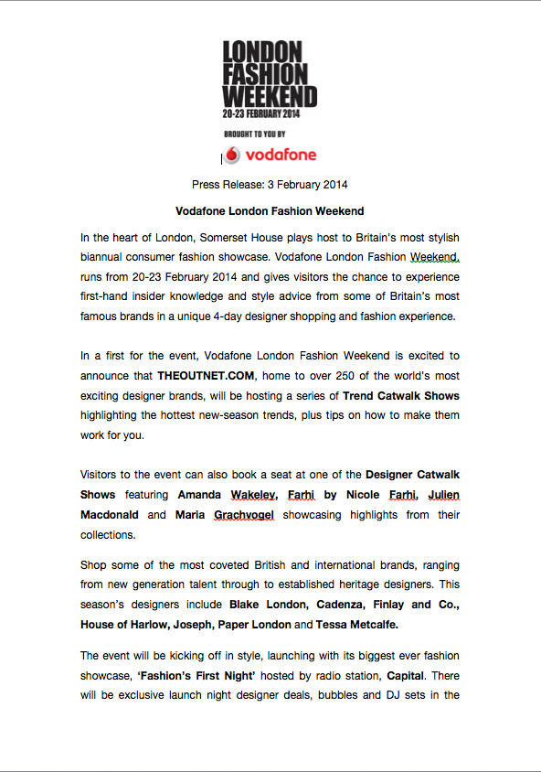 Applications for Vodafone London Fashion Weekend February 2014 are now open. Please download the form here and send it to Natascia Chiavarini at [email protected] to register your application. Closing deadline: Monday 2nd December 2014